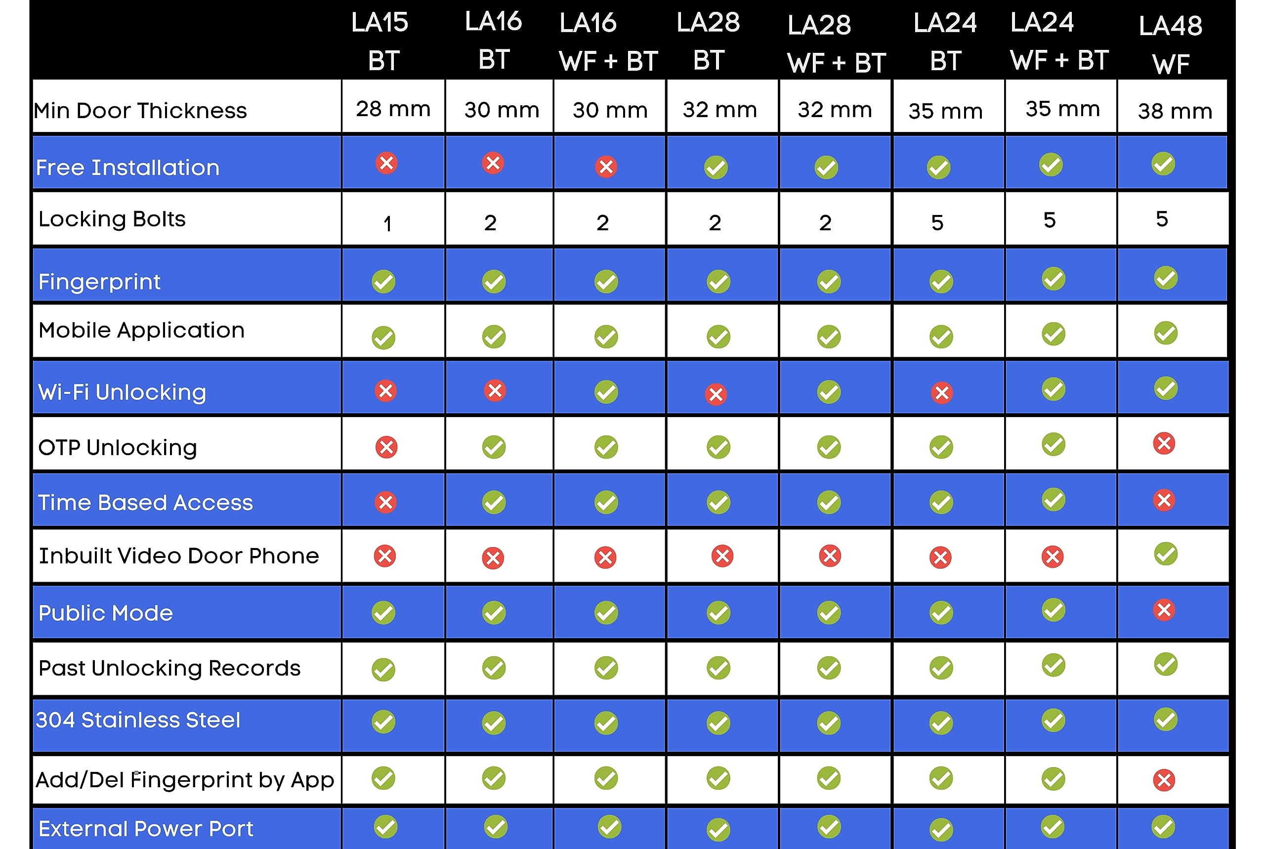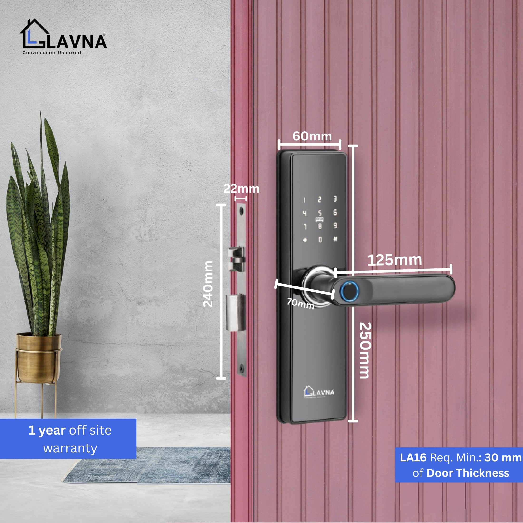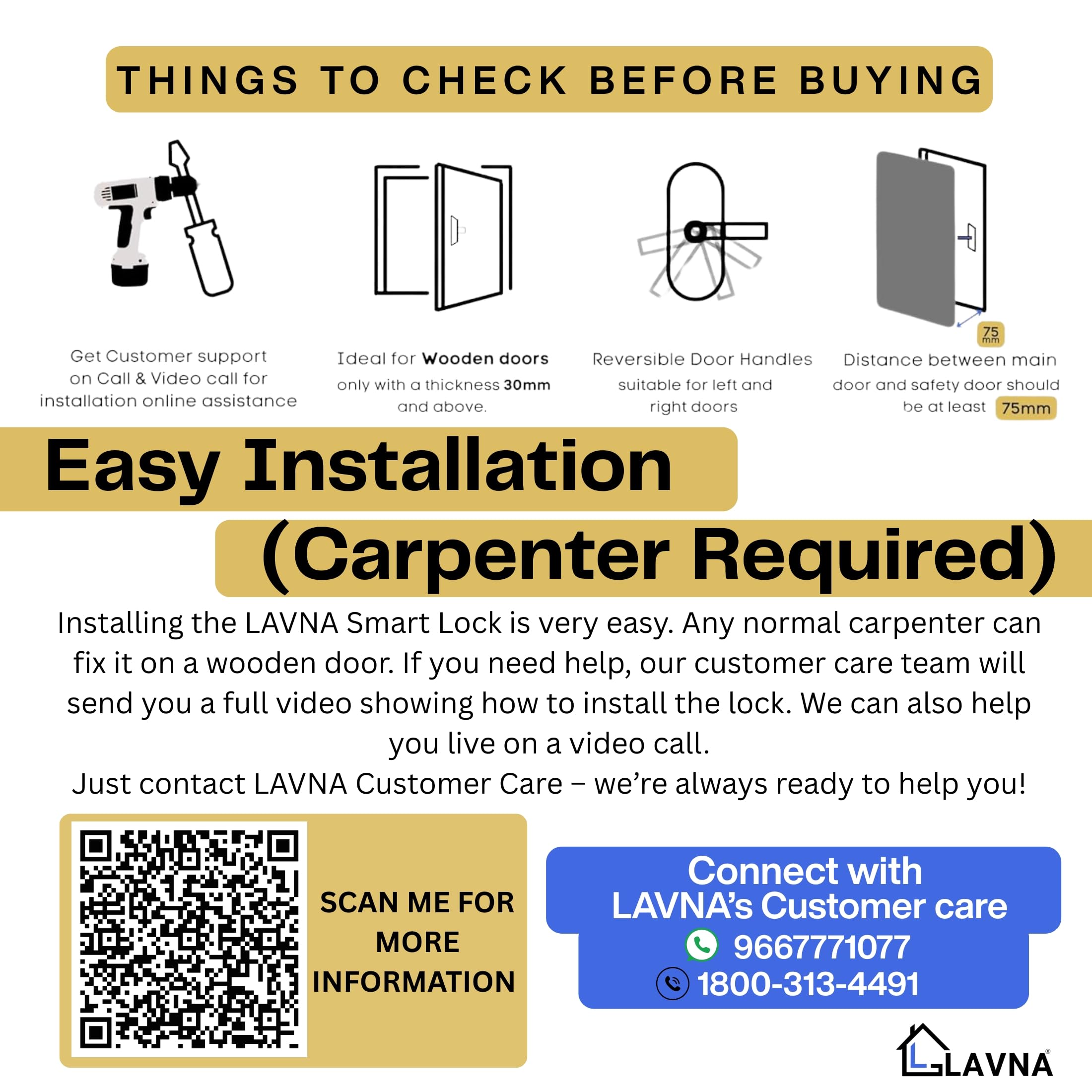 Details: All New LAVNA LA16 Smart Wifi Door lock, this is a Hightech Fingerprint Lock with strong features and simple to use. Minimum thickness required of the door is 30MM for proper installation and working of the lock. This Digital Lock makes your unlocking very easy. You can say that your finger, your key & no one can take your key. This lock will get connect to your MOBILE & you can operate your lock completely through mobile and when you are not at home you can unlock your door from Anywhere , Anytime. This lock will eliminate so many things like manual locking, making multiple keys for family members, no need to carry your key when you go out and so on. The lock is suitable for wooden door and it is universal and simple to install, It can be installed both the side left or right of the door & both opening indoor and outdoor. It is advised to get it installed after contacting to our customer support team for any HELP. It is very easy to install, any normal carpenter can install the lock for his complete help , our customer care team share the installation video and help on video call too. It is Do it Youself door lock installation, there is no installation service will be provided by the company , complete online support you will get