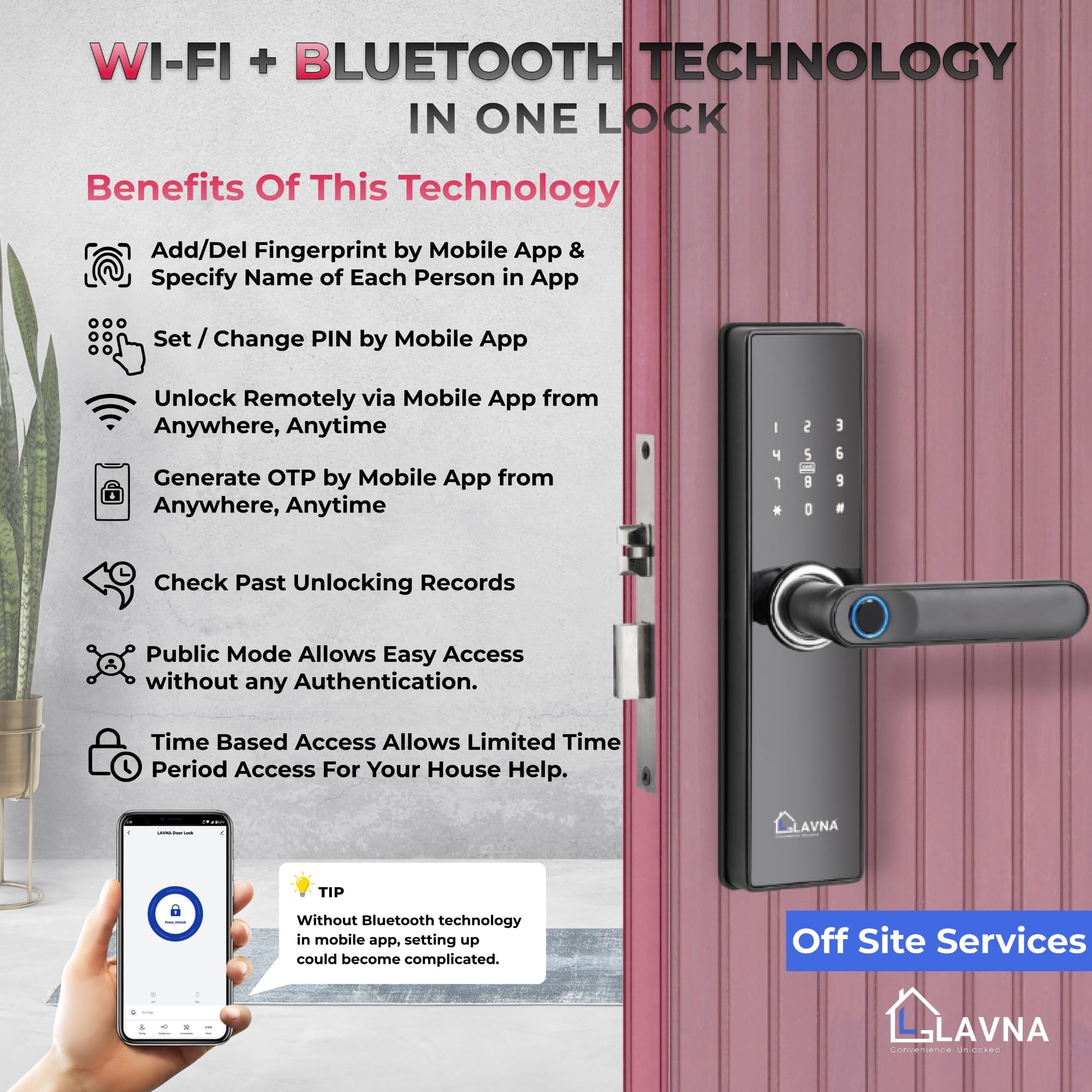 - WiFi + Bluetooth Mobile App. – You can unlock your Door lock from Anywhere, Anytime via your WiFi Mobile app and this lock also comes with Bluetooth technology as well so you can operate this lock completely through the LAVNA SmartLife mobile application. You can Add or Delete any user via mobile app.