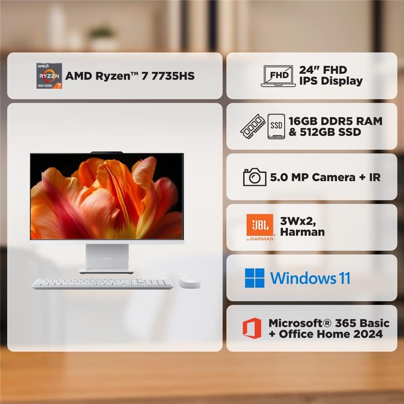 Details: The clean lines and compact frame of the Lenovo IdeaCentre AIO encase a singularly performance-driven machine, with up to AMD Ryzen 7 7000 Series processors for raw power and ultra-fast performance. And the tiny desk footprint of this quintessential family PC belies its entertainment features, including a wide three-sided narrow bezel FHD display and powerful stereo speakers by Harman