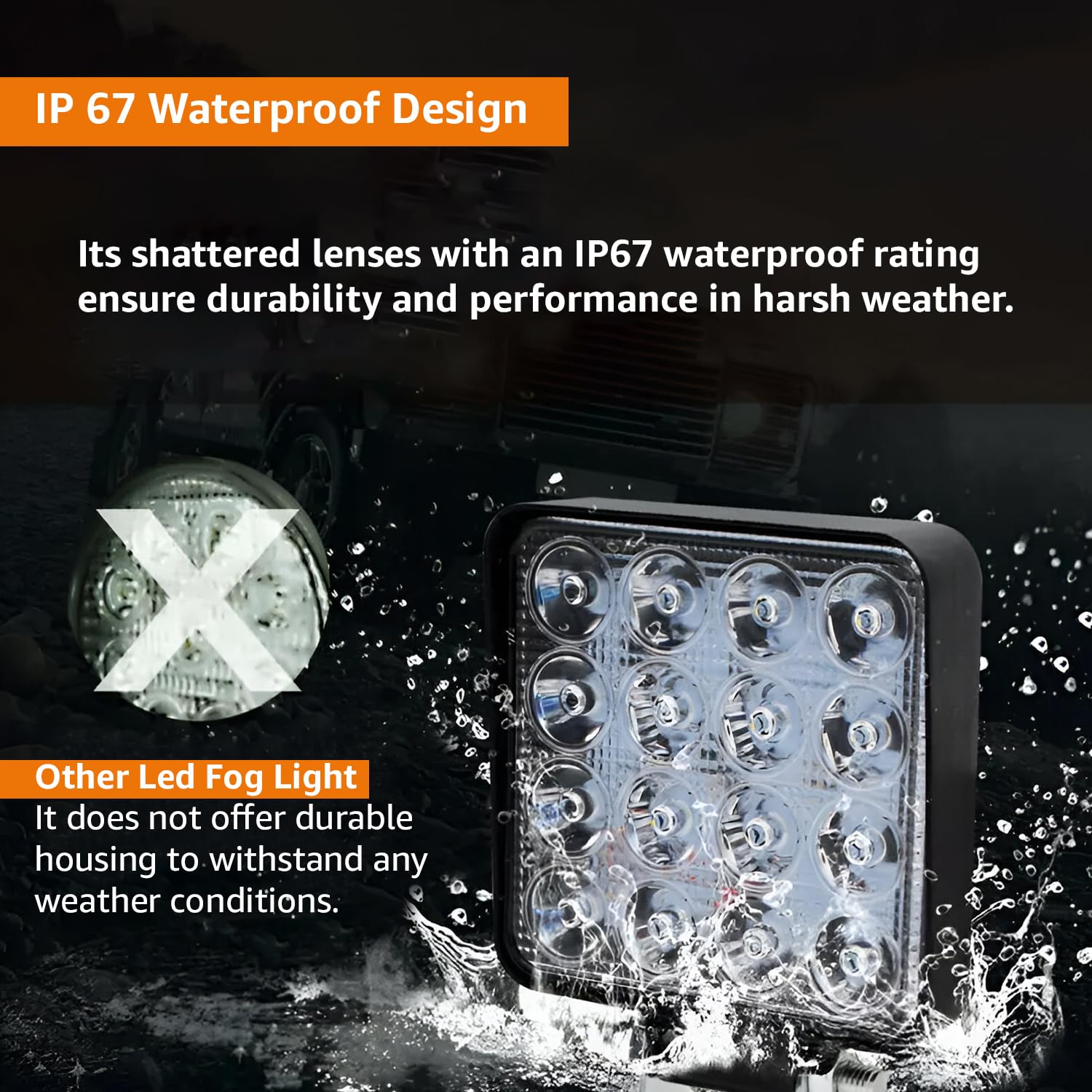 - FOCUSED BEAM TECHNOLOGY: The square focus beam design ensures a concentrated and directed light output, improving visibility and reducing glare. This focused beam is used for off-roading and driving in challenging conditions, providing a clear and precise light path.