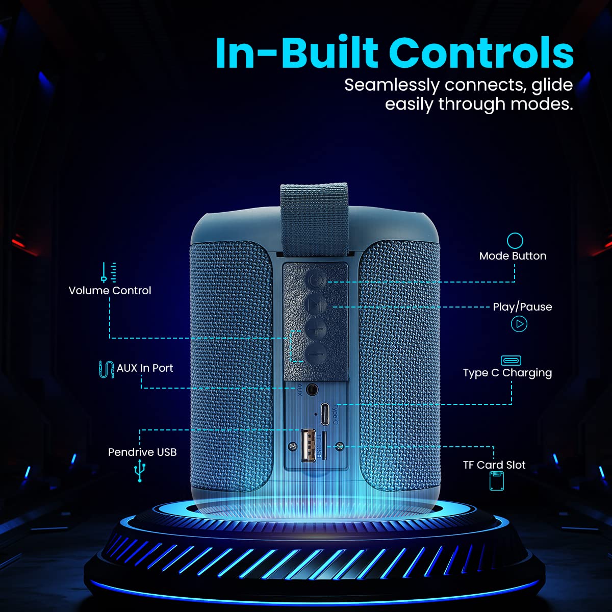 • [AUX IN PORT] : With its AUX In port you can further expand on the compatibility options and play any audio through it. It seamlessly puts out audio that runs out of the source device and finally through the speaker!